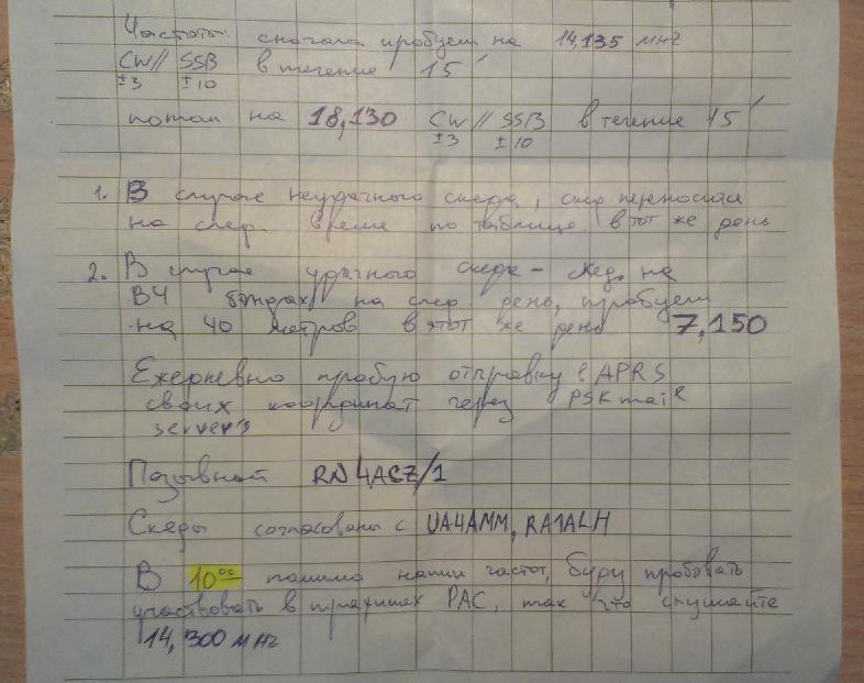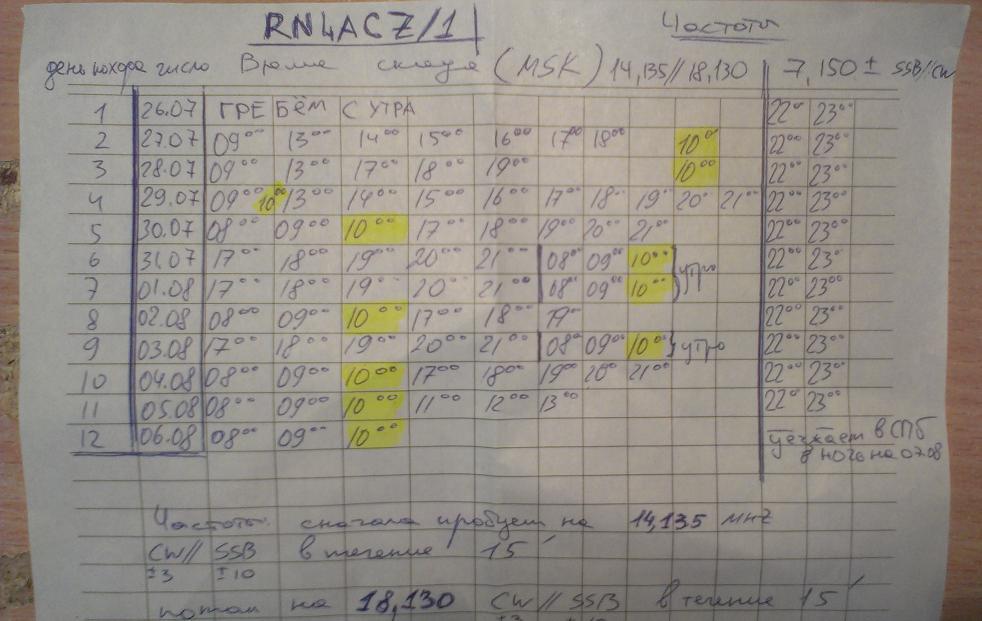 Сергей прислал смс из поезда проезжал Петрозаводск, просил меня опубликовать расписание его выхода в эфир. Конечно всё зависит от условий в которых будет экспедиция Сергея.Наверно не всегда получится выходить в указанное время. Будем слушать! У Сергея маленькая проверенная походами и соревнованиями QRP станция ft-817 и аккумулятор, для зарядки он планирует использовать солнечную батарею небольшой мощности. Публикую расписание выхода в эфир RN4ACZ/1 от Сергея. Счастливого пути!  адрес странички про экcпедиции RN4ACZ http://radiopohod.blogspot.ru/