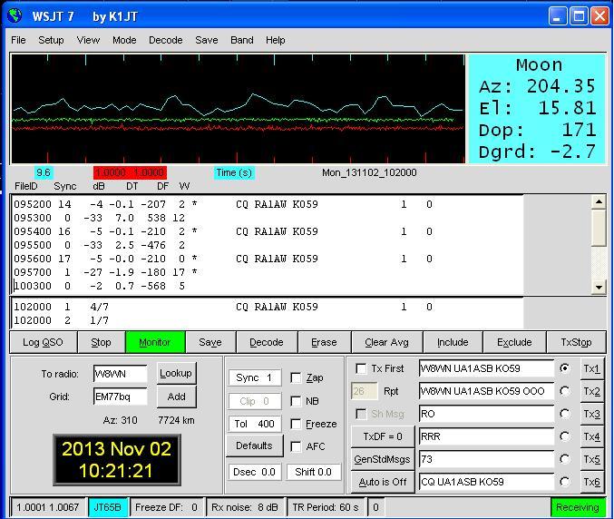 JT65B активно используется для работы ЕМЕ в участке от 144090 до 144170. На слух музыкальная шкатулка. Судя по азимуту это RU1AA с Белоострова.