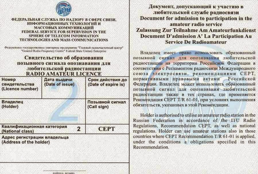 Каждое радиоэлектронное средство радиолюбителя должно быть зарегистрировано в территориальных органах Роскомнадзора — на него должно быть получено свидетельство о регистрации РЭС. Свидетельство о регистрации РЭС также представляет собой ламинированную карточку небольших размеров.