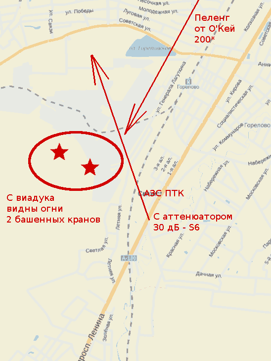 Частоту 435.325 слышно громко от ТЦ "ОКей", что справа на въезде в Горелово. Работают крановщики. Там же взял точный пеленг - 200 градусов, что точно параллельно Таллинскому шоссе на юг. Был в самом Красном Селе - слышно довольно слабо, 5 баллов с земли. На обратном пути, у виадука, где АЗС ПТК громко 9++. В машине на резинку 6 баллов. Оттуда взял пеленг через шоссе, т.е. ровно на Северо-Запад, на городок Горелово с аттенюатором 30 дБ. [b]Также, с виадука в Горелово видны 2 башни с огнями, похожие на краны. В эфире также звучало, что их 2. В само Горелово не поехал, т.к. надо менять дворники, плохо видно, очень плохая погода. Надеюсь, что с последним пеленгом, что на рисунке, не ошибся.