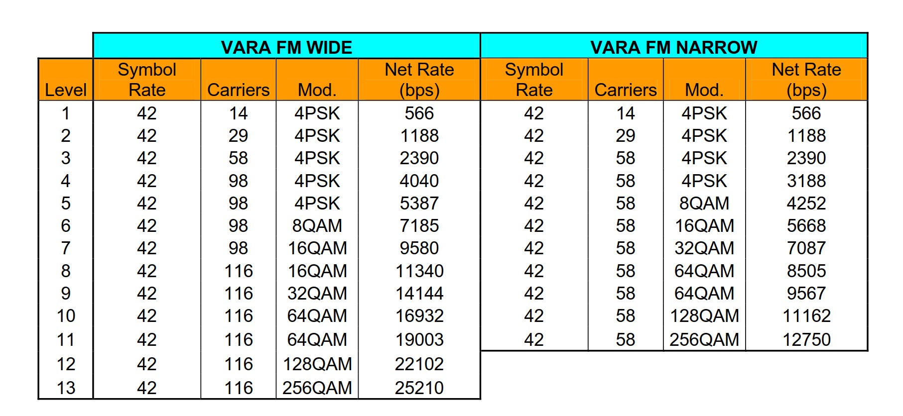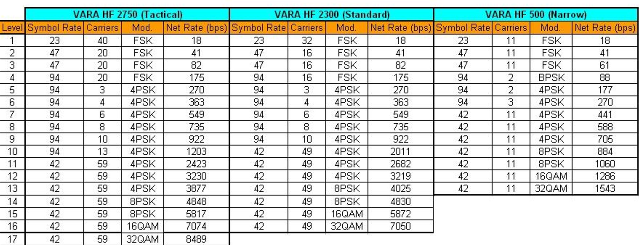 UA1C писал(а): А что за софт на компе? Запущен мультимодовый QtSoundModem от Джона G8BPQ, позволяет эмулировать до 4 портов в радиочастотном спектре в 3кГц на КВ, второе окно - второй QtSoundModem с портами на УКВ. https://www.cantab.net/users/john.wisem ... Modem.htmlИ да, как написал Василий, VARA модем. Стоит 70 баксов, умеет принимать и декодировать сигнал при соотношении С\Ш до -20Дб (во всяком случае у меня такие получились результаты, скорость была минимальна, 18 бод, но декодирование шло). Скорость вариабельна в зависимости от прохождения. Хороший конкурент проприетарных хардовых пакторовских модемов, уступает вроде как только пактору IV. Вот таблицы скоростей VARA HF\FM: Вложение: