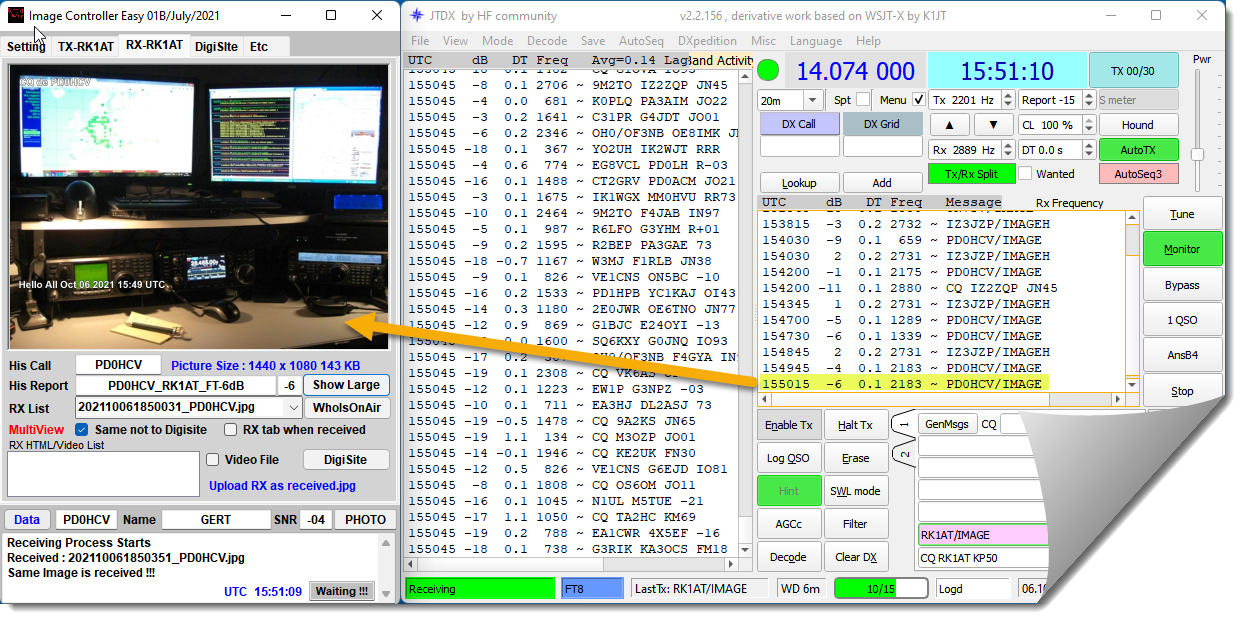 Автор программы JTDX UA3DJY по моей просьбе ввёл Show content фильтра в программу. Декодированные макросы вида CALL/IMAGE отображаются в правой части приемного окна программы. Принятый программой макрос обрабатывается image controller и выводит содержимое на экран монитора.