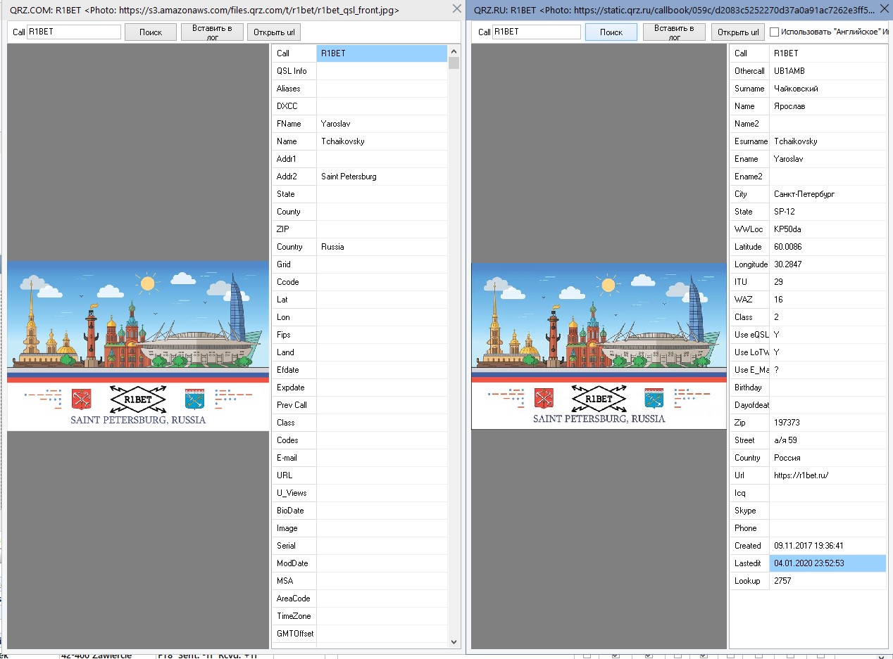 R1BAH писал(а): Не понимаю.. а что еще надо? Может мы про разные вещи говорим? Как минимум, еще очень полезная информация локаторе, рда, способе qsl обмена, емаиле, почтовом адресе и т.д. Вот для примера, на qrz.com и qrz.ru заполнены примерно одни и те же поля в коллбуке. Слева то, что отдает не платящим пользователям qrz.com, а справа qrz.ru: Вложение: