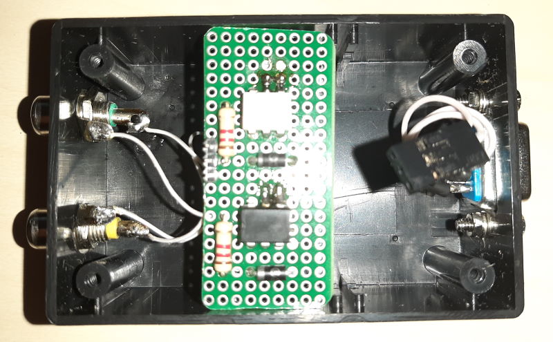 Вставил в пластиковую коробочку с двумя RCA разъемами и одним DB-9, к которому подключается адаптер USB-COM.