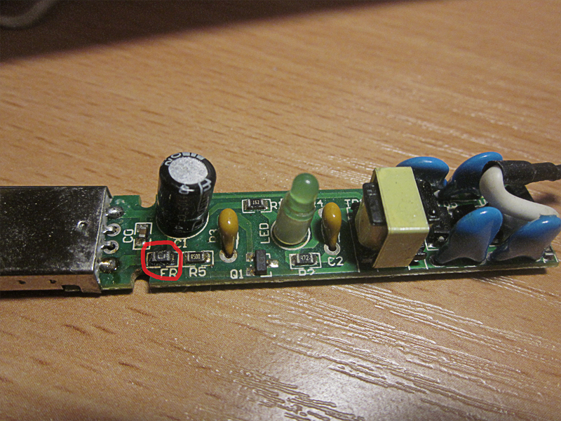 Здравствуйте. Достался в пользование USB ионизатор. Данный аппарат оказался не рабочим. Когда разобрал корпус увидел, что сгорела одна деталь. Я не силен в радиотехнике, но судя по обозначению на плате и поиска инфы в гуле, выяснил, что это может быть предохранитель. Но не смог по маркировке детали найти нужную. Помогите, пожалуйста, с опознанием детали. Заранее спасибо. PS На самой детали была маркировка 401 или L01, что-то похожее. Я пытался удалить налет сажи и стел надпись:(