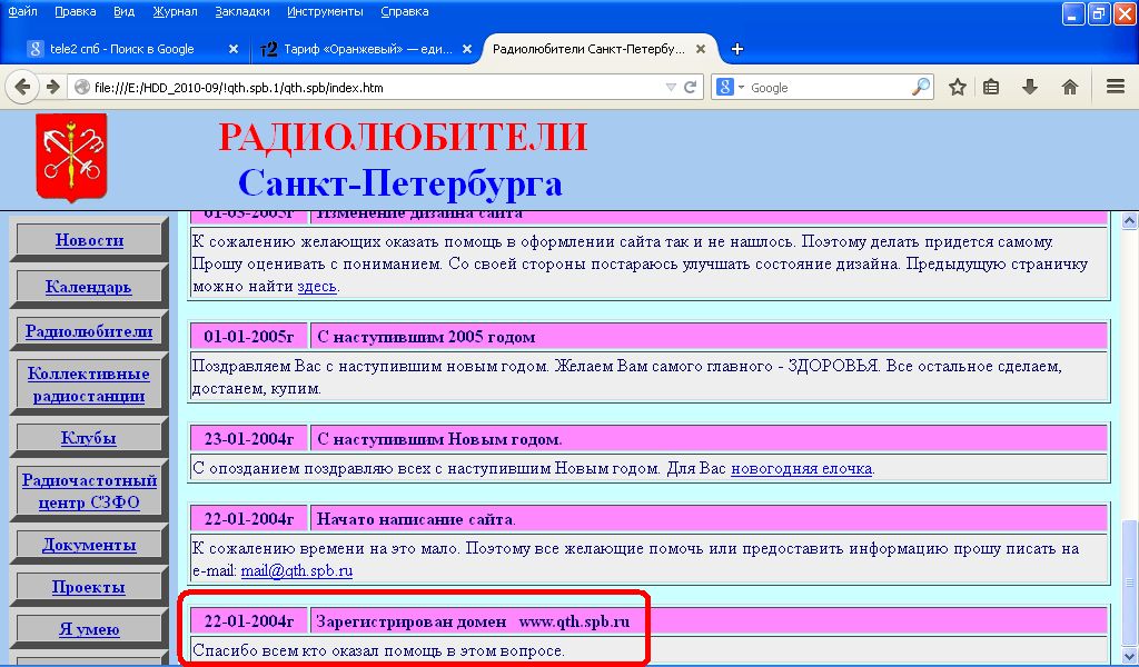 Разбираясь в архивах, поднял старые записи по сайту. Оказалось, что нашему сайту "Радиолюбители Санкт-Петербурга" 22 января 2015 года исполняется 11 лет! Уважаемые друзья, коллеги, единомышленники! Поздравляю с данной датой. Спасибо за поддержку и интерес к данному ресурсу. Общими усилиями мы с Вами создали интернет площадку для нашего общения. Не может не радовать тот момент, что для кого то наш с вами ресурс стал отправной точкой в мир нашего хобби. Кому то он помог в решении возникших технических проблем. А главное, что ресурс QTH.SPB.RU объединяет всех нас, наряду с клубами и дружескими интернет-ресурсами. Надеюсь, что у сайта впереди еще долгие годы существования. 73!