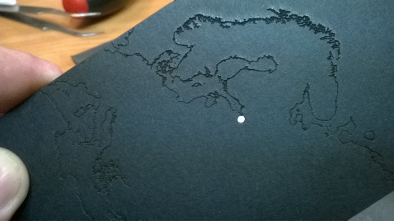 на чёрном прямоугольнике из пластика лазером нанесены конуры стран, угадывается скандинавия, средиземное море... и дырочка, ровно в том месте откуда получен рапорт, то есть в Петербурге. Внутри также лежала маленькая бумажка с улыбающейся коробочкой-спутником.
