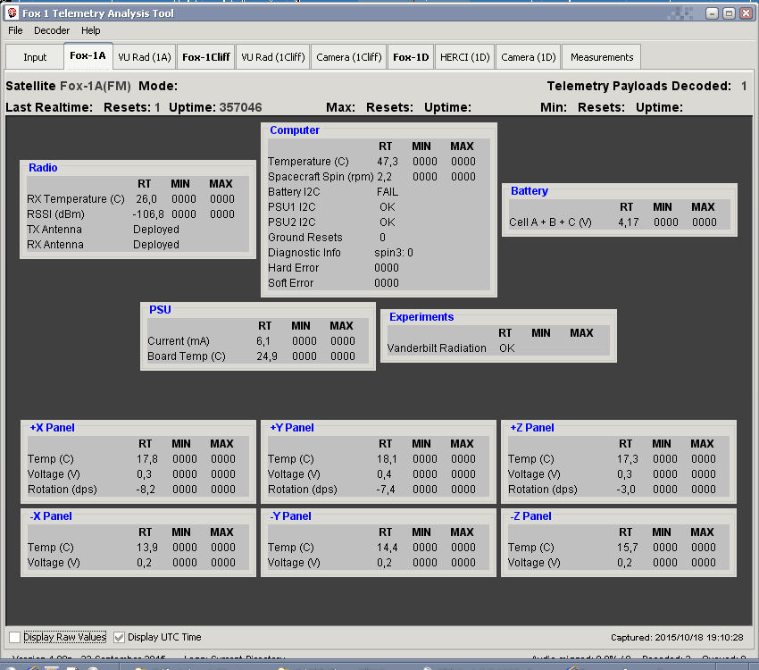 Телеметрия спутника Fox-1A крайнего прохождения над СПб (декодированная с помощью программы из шапки темы. Декодирование идет из режима FM (частота приема 145.977 МГц, частота дискретизации звука 48000 кГц). Вложение: