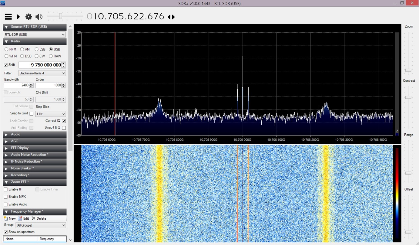 Приём в аналоге - на 10489.550 - 10489.800 MHz линейная поляризация, диаметр тарелки 80см. IMHO необходимо: а) найти малошумящую спутниковую головку Ku-band с линейной поляризацией и хорошей стабильностью частоты и частотой гетеродина 9750 МГц. Первое попавшееся (возможно, не отличается стабильностью): Aliexpress - 0,1db NF. б) Чтобы переключиться в нижний диапазон нужно подать тон 22 кГц. Или есть ещё LNBF, которые переключаются напряжением 13 В. Т.к. задающий генератор на 9,75 ГГц, без проблем преобразует частоту 11489.5 МГц в частоту 739.5 МГц. см. калькулятор https://www.satellite-calculations.com/ ... quency.htmв) Приём на RTL-SDR на частотах 739.5...739.9 МГц. Передача - мощность 5W на 2400.050 - 2400.300 МГц и антенна с усилением 22.5 dBi (тарелка 75cm) Источник: https://amsat-uk.org/satellites/geosync ... /eshail-2/Основную сложность представляет UP-конвертер с диапазона 144 МГц в диапазон S-band 2.4 ГГц. https://shop.kuhne-electronic.de/kuhne/ ... /EsHail-2/ цена 799,00 €