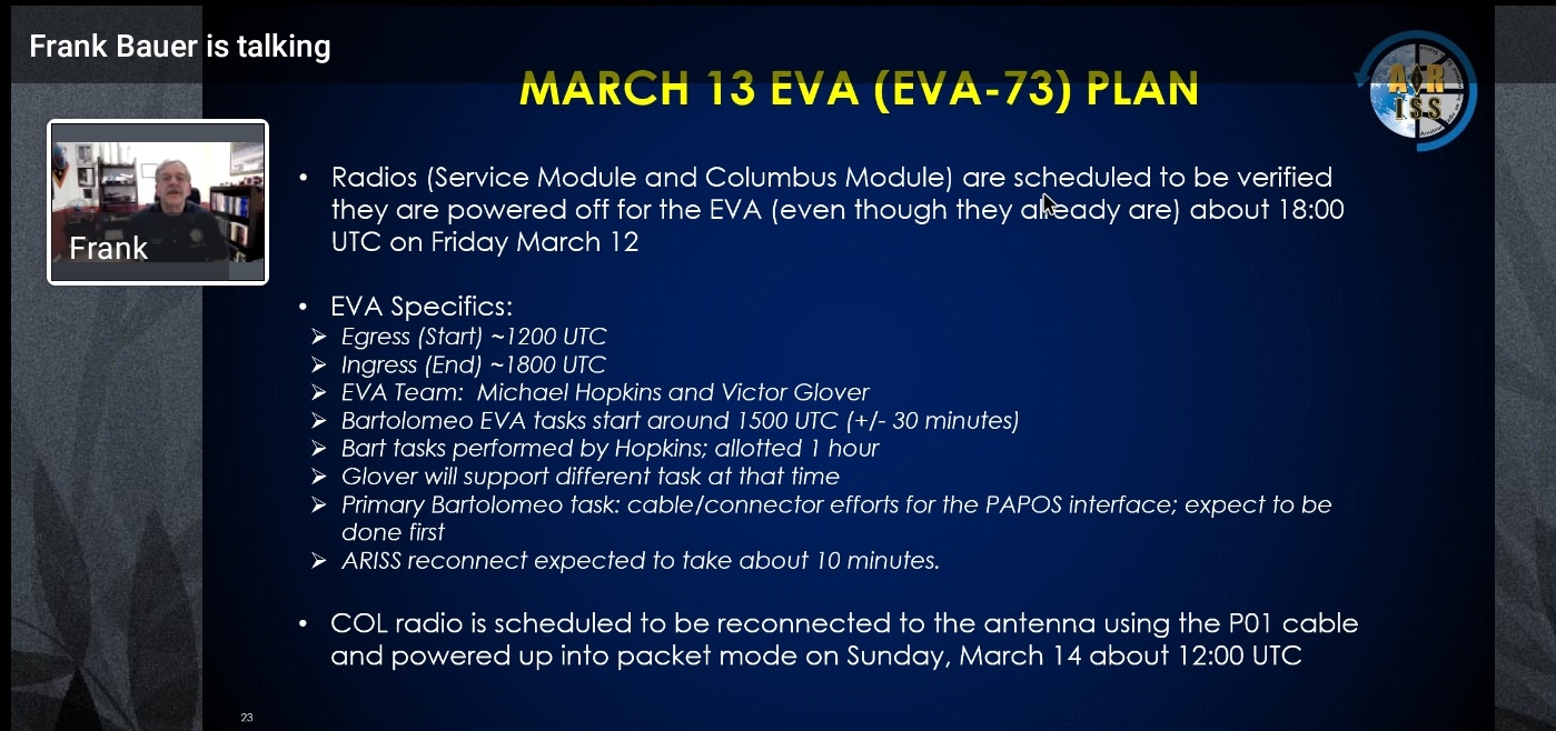 Передатчик в модуле Колумбус не работает после выхода в открытый космос американских астронавтов 27 января. Команда МКС проведёт 10 марта пресс-конференцию длительностью 45 минут, чтобы рассказать о проблеме и перспективах любительской радиостанции на МКС ARISS News Release No. 21-17 David Jordan 9 Мар 2021 17:22 Оригинал: https://mailman.amsat.org/hyperkitty/li ... HCRYV5ATP/ ARISS News Release No. 21-17 Dave Jordan, AA4KN ARISS PR aa4kn(a)amsat.org
