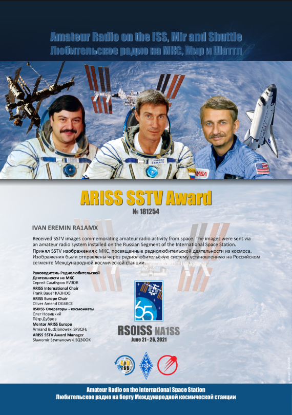 **ОБНОВЛЕНИЕ - 22 июня** SSTV будет отключен 25 июня с ~06:35 до ~19:35 UTC для поддержки выхода в открытый космос (EVA) астронавтов США.. **ОБНОВЛЕНИЕ - 23 июня** Мы имеет некоторые изменения в датах деятельности. SSTV с МКС получит другой день для компенсации периода отключения. Передачи должны идти до 27 июня ~18:30 UTC после завершения EVA. https://ariss-sstv.blogspot.com/2021/06 ... r-and.html