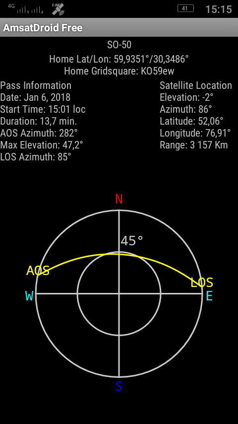 Только что SO-50, принимал UR3CTB, UA9FFF, PA1RB, R3GY. Очень хороший виток через Север, принимал на 5-элементный "волновой канал" от 57 до 59 (5 делений по S-метру, где-то треть шкалы). Позвал R3GY, но не услышал себя, т.к. забыл запрограммировать в ячейки памяти тон CTCSS 67.0 Гц. Довольно большие паузы, можно было вклиниться. Программа для отслеживания под Android: известная AMsatDroid Free.