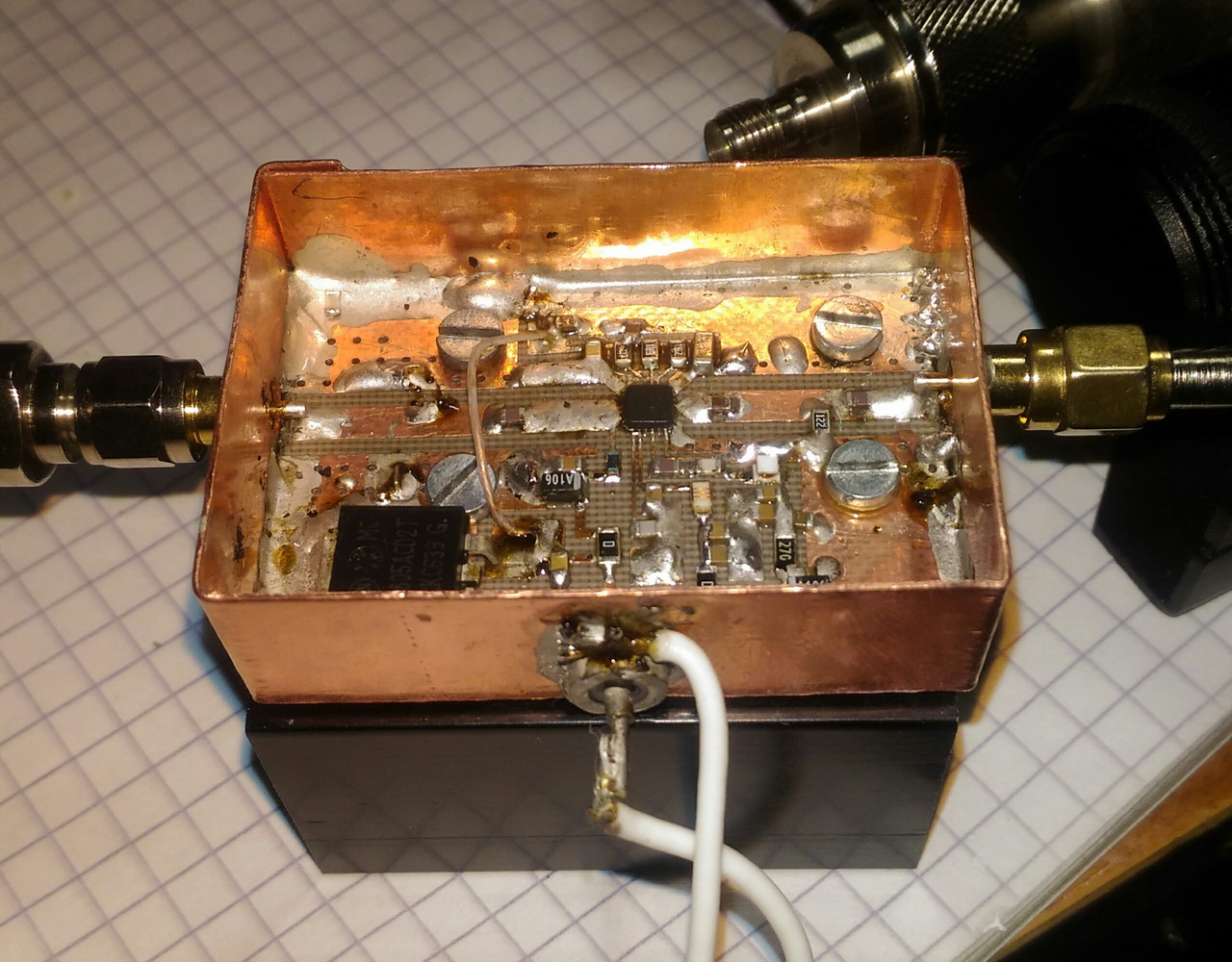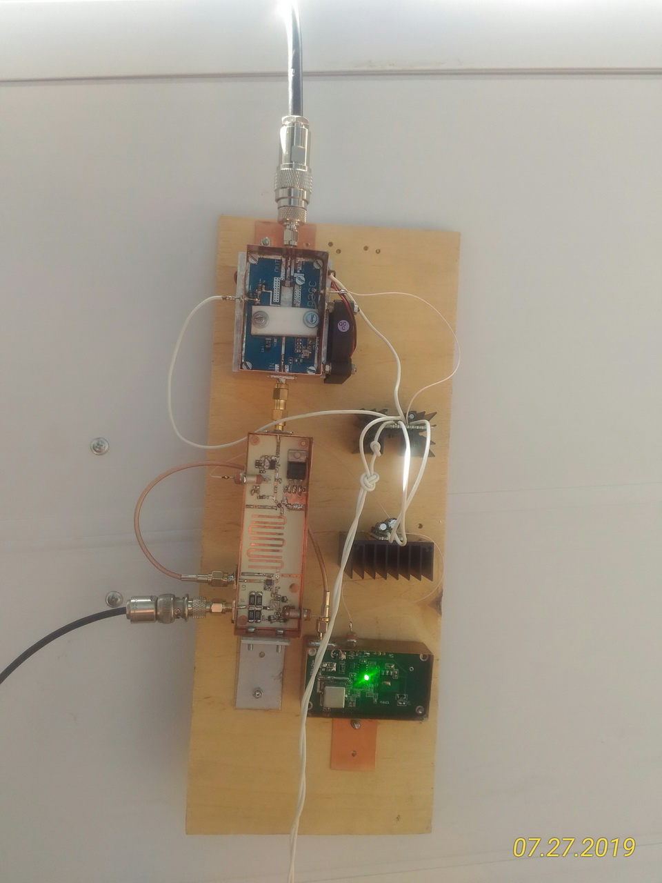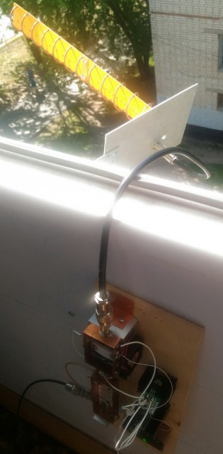 это был эксперимент: с прибора брал 10 дбм, подавал на самодельный усилитель и через кабель на антенну. измерить точно не удалось т.к. прибор в это время работал в режиме генератора. начал делать смеситель для возможности смешивания гетеродина с частотой 435 мгц с трансивера. пока делаю аппаратуру. эксперемент проводил чтобы выяснить - будет ли достаточно компактной спиральной антенны и как точно ее потребуется наводить на спутник. получилось довольно просто... на спутник наводится легко