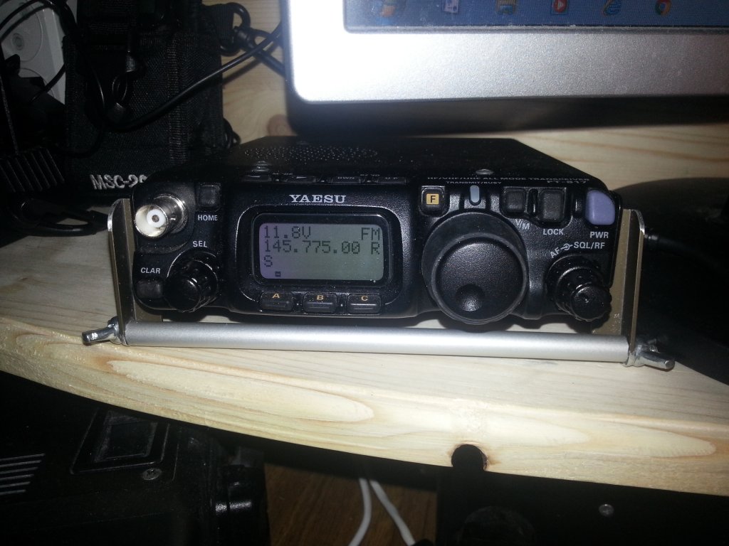 В полной мере ощутил неудобство пользования от отсутствия подставки, которая приподнимает лицо ft-817. В интернете нашел достаточно вариантов исправить ситуацию, но в результате пошел своим путем и сделал подставку из того, что было под рукой: уголок, трубка 8 мм, резьбовая шпилька М4, два барашка. Шпилька стягивает уголки, остальное ясно из фотографий. Прикладываю - может кому-то пригодится.
