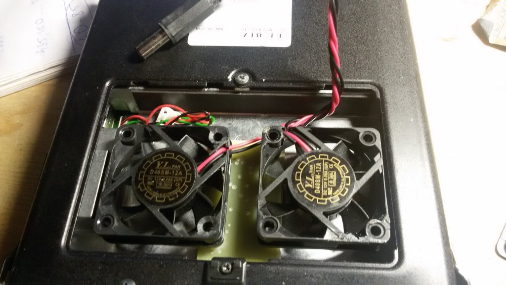 Что не хватает ft-817, так это принудительного воздушного охлаждения. В принципе, если работать недолго, то и не страшно, но вот раз я "зацепился языком" и убедился, что если активно работать на TX минут 20-30, то шасси разогревается конкретно. Хоть яичницу жарь. Шучу конечно про яичницу, а вот про конкретный разогрев - нет. Учитывая, что шасси у трансивера единое и литое, доступ к нему есть в батарейном отсеке. Градиент температуры, естественно, есть: задняя панель нагревается сильнее, но и в батарейном отсеке тоже чувствуется нагрев. Увеличивать габариты не хотелось, поэтому разместил вентиляторы под крышкой - снял ее, подключил разъем к ответвлению БП или аккумулятора, и вперед. Если не надо - убрал. Вентиляторы размещены на узкой стеклотекстолитовой планке, которая приклеена к шасси на двухсторонний липкий скотч. Под вентиляторами оставлено пространство для движения воздуха. Вентиляторы выбрасывают воздух наружу. Естественно, сам трансивер нужно приподнять спереди - на подставке.