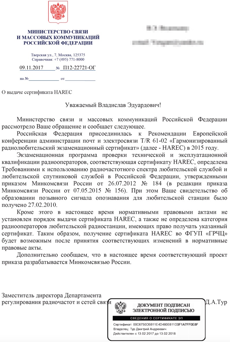 Может, кому будет полезно. Переехал в Германию, озадачился получением местного позывного. У меня свидетельство СЕРТ образца, переслал копию в местный РЧЦ - Bundesnetzagentur - вместе с заявлением о признании российской лицензии в соответствии с CEPT. Из Bundesnetzagentur ответили, что без проблем, только нужен еще сертификат о сдаче экзаменов на категорию по форме HAREC, принятой в СЕРТ. Запросил его в ГРЧЦ, там послали куда подальше. Настрочил кляузу в Минкомсвязь, получил вот такую отписку: Вложение: