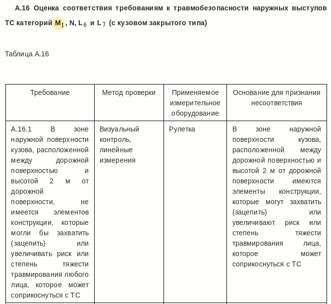 Для автомобилей контролируются острые кромки на высоту до 2 метров. Не должно быть выступающих частей, от которых может обраниться человек при прикосновении или "утяжелить последствия".