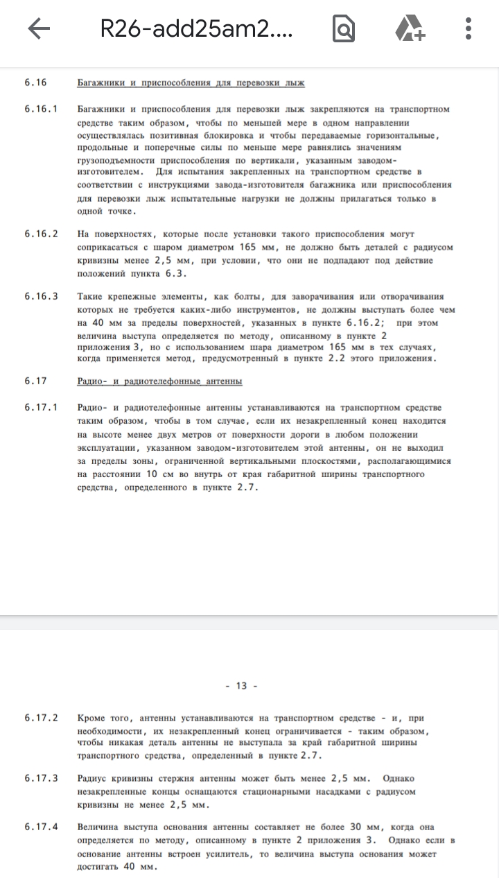DO1AIE писал(а): Коллеги, не нападайте на человека. Организация клуба "юный юрист" имени себя правилами форума не возбраняется  Многие темы просто мертвы, а попытка их реанимации вызывает негативную реакцию одних и тех же персонажей. Я не юрист, но многое можно найти без посторонней помощи. https://xn----7sbhaldrafo0catmhegeecb4a ... 517701500/На автомобильные антенны Sirio и Diamond точно есть сертификаты, про остальные не знаю. На багажник тоже должен быть сертификат. Сейчас мы все живём по правилам 26-02 и 26-03 Организации Объединенных Наций. https://www.rst.gov.ru/portal/gost/home ... s/eecrulesПро антенны говорится в п. 6.17.1-6.14.4 документа 026-03, файла R26-add25am2.pdf Вложение: