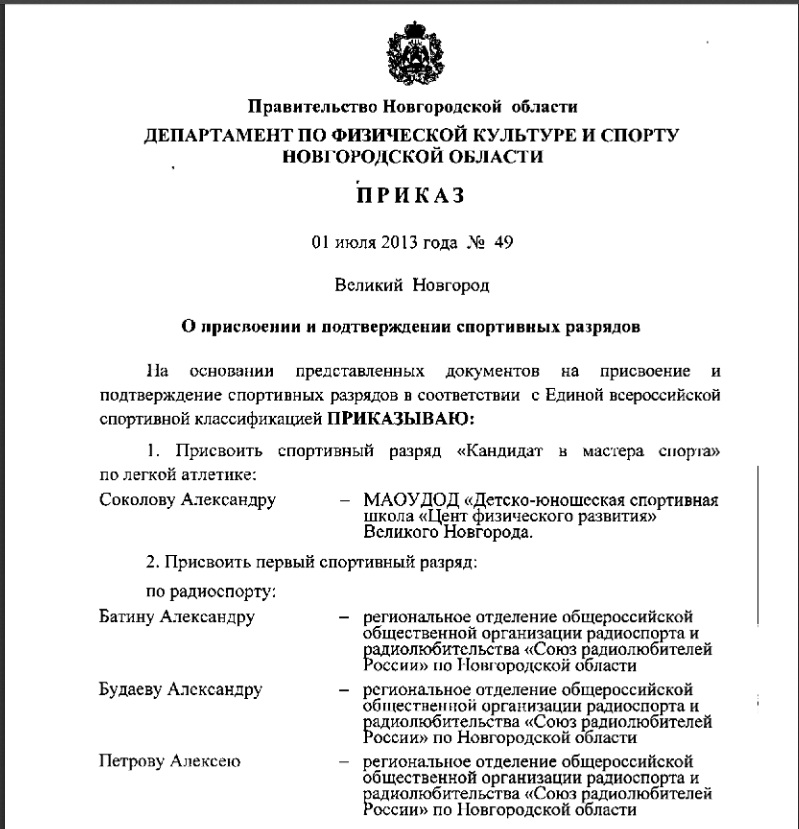 R1TB писал(а): Ребята, какой бред несете!!! Новгородская команда всегда выступала как представитель Новгородского областного комитета по спорту. На основании ЕВСК и протокола связей производился подсчет очков и принималось решение о присвоении разряда. Если чемпионат открытый - могут китайцы приехать, если они члены своей спортивной организации. И только в своей спортивной организации они будут получать звания и премии. А вот медали выдают организаторы. Ну а насчет людей, собравшихся в одну дружную группу из разных мест, извините. Такое действительно не предусмотрено. Команда должна оформить документы, а не просто собраться в нужный момент по пейджеру. Вы же хотите официально что-то получить. Бурные аплодисменты при победе вы и так получите. Команду на судно набирает управление судоходства, а не боцман Васильич. Вы не читаете внимательно. Вам пытаются объяснить, что совсем недавно были внесены правки после одного судебного дела. Теперь на основании протокола ГССК из Петербурга никто Вам ничего не присвоит в Новгородском спорткомитете. Прочтите внимательно ещё раз. БЫЛО - СТАЛО! R1TB писал(а): Вот этим отличается присвоение от выполнения нормативов при участии в спортивных соревнованиях. И что этим хотели сказать? Я могу свою книжку КМС и значок тут показать. Дальше что?