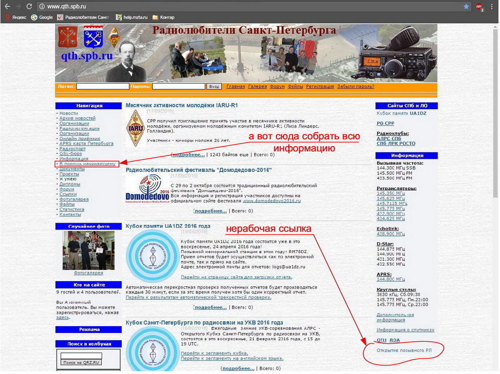UA1CFX писал(а): ub1ajs писал(а): Вкладка "Открытие позывного РЛ" в данный момент вообще не работает http://www.qth.spb.ru/modules.php?name= ... ges&pid=13А на какой странице ссылка на эту вкладку стоит? Да, надо серьёзно заняться реструктуризацией разделов. Информационное наполнение по получению позывного у нас уже актуализировано благодаря R1CF, осталось реструктуризацию провести, что бы информация находилась легко. Ссылка стоит на главной странице http://www.qth.spb.ruБез актуальной информации сосредоточенной в одном месте к сожалению будет эффект замка на двери.