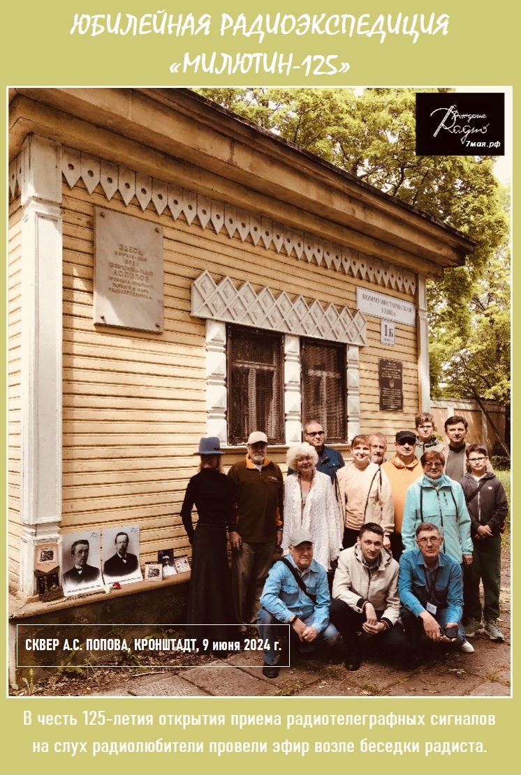 9 июня 2024 г., в честь 125-летия открытия приема радиотелеграфных сигналов на слух, под окнами кабинета изобретателя радио увлеченно работали в эфире 12 радиолюбителей: RA1L, R1BIL, UA1CDA, RA1AGN, RA1AD, RC1BP, UB1ARE, UB1ARF, R1AABW, R1BNJ, R1BBT, EU8MM. Возле беседки пронзительно звучал юбилейный позывной - R320KT, который приурочен к 320-летию Кронштадта. Также хочу выразить благодарность работникам Историко-мемориального зала А.С. Попова за познавательную экскурсию. Благодаря вам мы смогли окунуться в историю радио еще раз. Уже совсем скоро, 15 июня 2024 года, на форту «Граф Милютин» состоится второй день юбилейной радиоэкспедиции. Давайте собираться почаще и проводить яркие радиоэфиры! С почтением, Е.Ю. Рыбкина