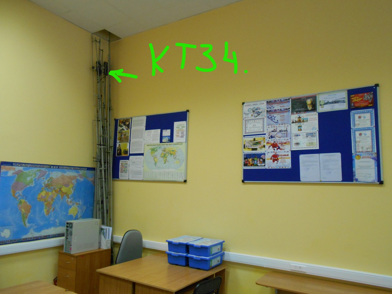 Антенна для ВЧ типа КТ-34 была подарена более года назад Александром, забрана из гаража и стоит в углу класса под постоянным приглядом.