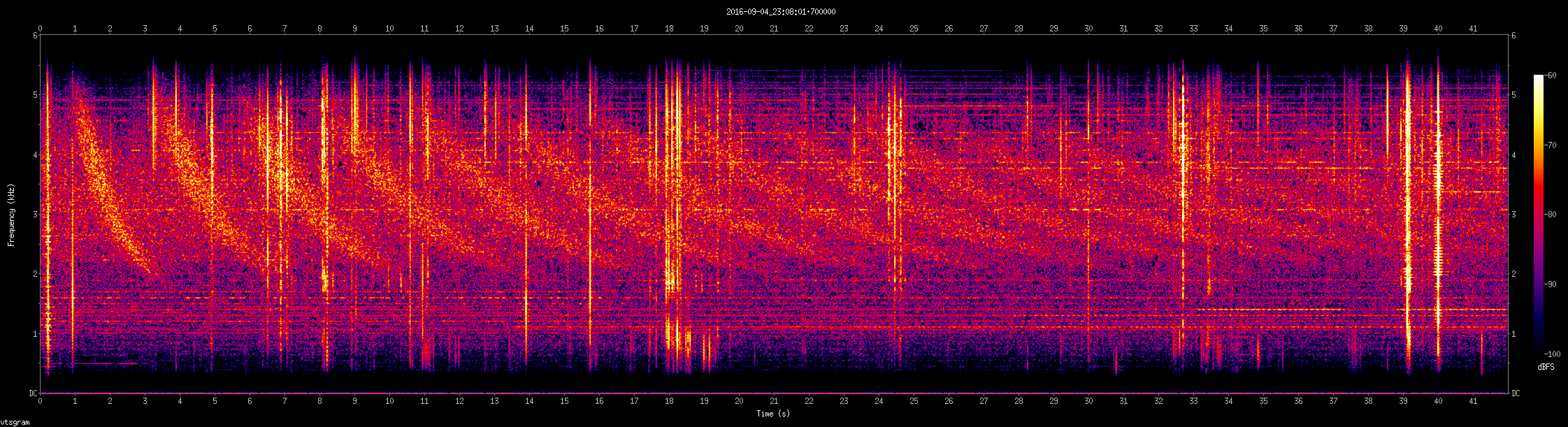 Принимать "Вистлеры" на раскрытый Деген, это,IMHO примерно как кипятить чайник на атомном реакторе... Гораздо проще собрать приёмное устройство на обычном малошумящем УНЧ. С каким нибудь простейшим ФНЧ и ФВЧ. В дополнении к моему крайнему, уникальному (не побоюсь это слова) приёму. С яхугруппы VLF/ULF прислали скрин-сонограмму этого кругосветного эха, насчитали аж 19 ! повторов.