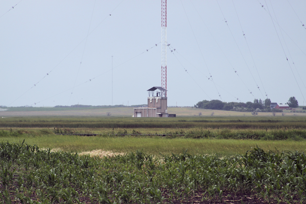 К средним точкам проводников антенного полотна подключены излучатели длиной от 306 до 366 метров (см. рис.E.3 и E.4), соединенные с помощью двух шестипроводных фидеров параллельно друг с другом в две группы в соответствии с делением антенны на секции, и далее через удлиняющие индуктивности-геликсы, расположенные в здании передатчиков, с выходами передатчиков. Излучатели содержат по два провода из полого медного кабеля диаметром 0,91 дюйма. С помощью оттяжек с противовесами они на большей части своей длины удерживаются в вертикальном положении.