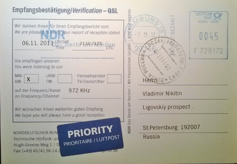 QSL карточка от NRD Info Hamburg за приём на частоте 972 кГц.