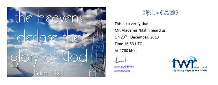 E-QSL от TWR Africa из Свазиленда 50 kW, за приём на 4760 кГц