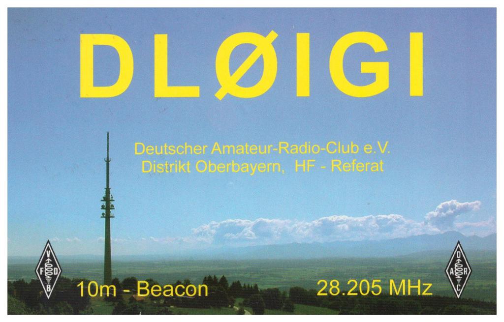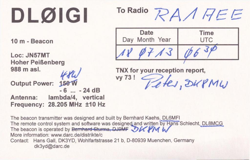 Принял его позавчера днем. Date: 2013-07-18 Time: 06:30:00 UTC Frequency: 28.205 MHz RST: 559 Текст DL0IGI Beacon PWR 48W Отправил рапорт на электронку, попросил QSL-карточку, пока не ответили