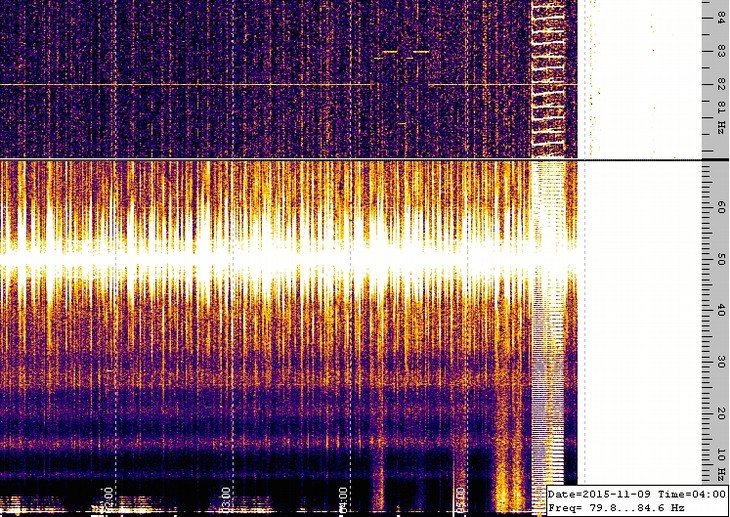 частота 30 Герц. 14 декабря 2015 Неопознанный сигнал, начало передачи примерно в 00:20, окончание в 01:00 MSK (не помеха, поскольку зеркального сигнала выше не было!) Ниже сигнала (протянувшись по горизонтали, видны резонансы Шумана) Место приёма Санкт-Петербург, LNVA по схеме Renato Romero, Т-антенна на крыше., USB карта, ноутбук и SpectrumLab