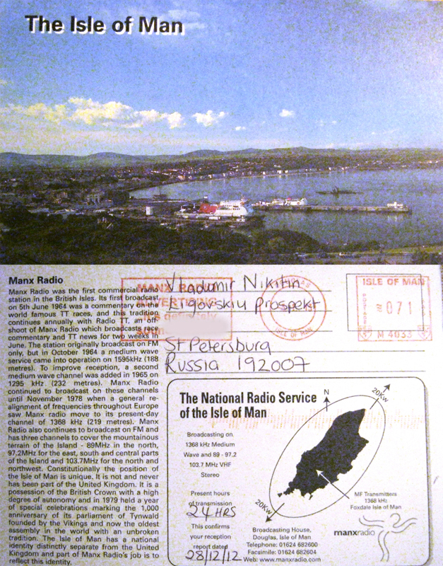 Радиостанция MAN-X радио, которая вещает с острова Мен, прислала свою QSL ку Принимал их на средних волнах, частота 1368 кГц, 28 декабря 2012 года Мощность передатчика всего 20 KW, Охотился я за этой станцией, ежедневно прослушивая частоту больше месяца. Вложение: