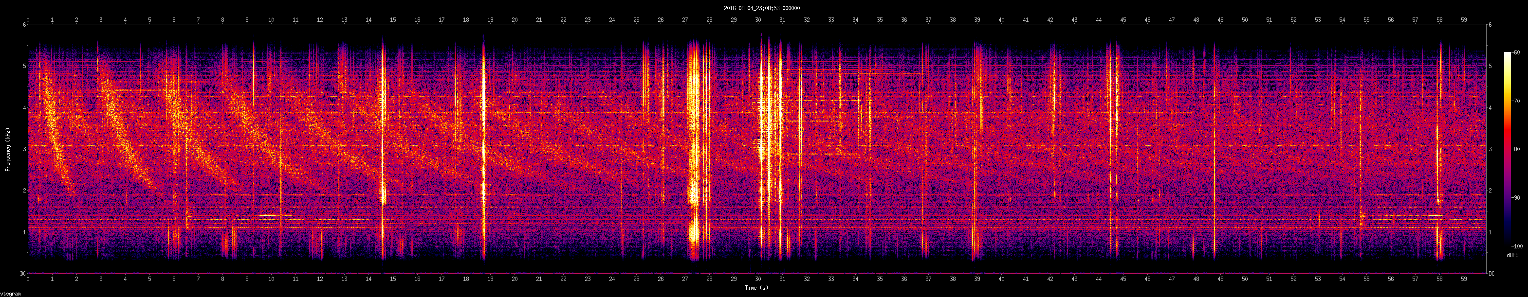 Вчера в ночи (в связи с очередной солнечно-магнитной бурей) принимал сигналы ОНЧ диапазона. Когда проводное радио "замолчало" в районе 3 кГц прекрасно были слышны так называемые "райсеры". Короткие сигналы с тоном на повышение. Но привлекли внимание не они, а интересный мультитоновый сигнал в районе от 0.6 до 2.5 кгц переодически включающийся. (на спектрограмме короткие горизонтальные сигналы в полосе 5 кГц) И слышимый звук картой. Причём программа Spectrum lab обладает мощным инструментом по подавлению промышленного фона 50 и 100 Гц. Приём ведётся непосредственно в городе, как говорится "не вставая с кровати" На крыше в центре Петербурга короткая T-антенна, крыша вся из металла. Кабелем в квартиру. Предназначение и принадлежность этого мультитонового сигнала мне не известна. Возможно это какая-то техногенная система его генерирует. На 10 секунде слышен двойной "Вистлер"