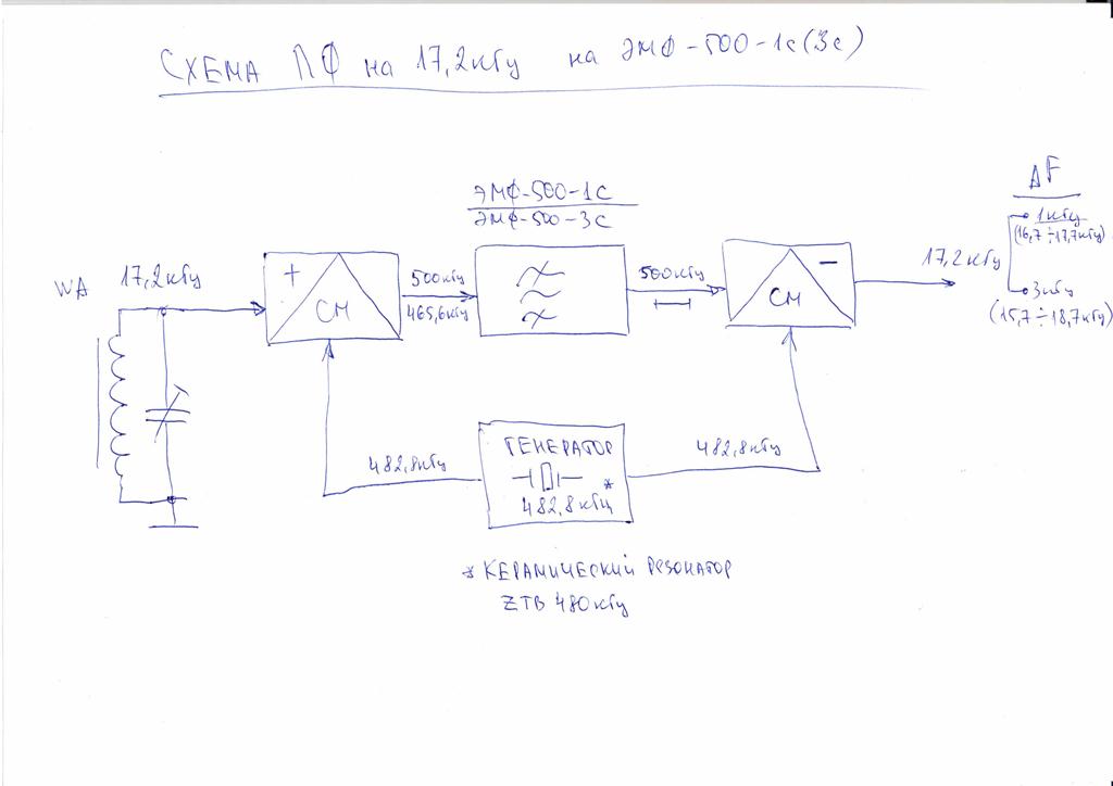 RL1L писал(а): RA1AMO писал(а): Тоже думал в этом направлении. Но попробую все же сделать классический супергетеродин с низкой и узкой ПЧ, и поэкспериментировать с антеннами. Как идею рассмотрите такую схему фильтрации на 500 кгц. Два смесителя по любой схеме, между ними ЭМФ на 500 кгц, с желаемой полосой пропускания, ну например 1 кгц. Если нужно можно упч несколько каскадов для компенсации потерь в ЭМФ или смесители активные (например на КП327, BF998) и на оба смесителя подать одинаковый сигнал, точнее один и тот же, гетеродина 500 кгц плюс или минус основной сигнал 17.2 кгц. Гетеродин лучше сделать на 5 мгц после делитель на 10 на микросхеме типа ие2, ие4, вообщем любой делитель на 10. Кварц на 5 мгц последовательно через емкость или катушку, ими можно двигать частоту в широких пределах, для точной подстройки частоты гетеродина. Получился преселектор с переносом на 500 кгц фильтрацией и обратным переносом на 17.2 кгц, а далее на звуковую карту ну и она уже все оцифрует. Применение в первом смесителе полевого транзистора дает высокое входное сопротивление и можно подключать ферритовую магнитную антенну непосредственно. Структурная схемка к выше написанным словам. В чипдип есть керамические резонаторы на 480 кгц, их можно применить и схема упростится.