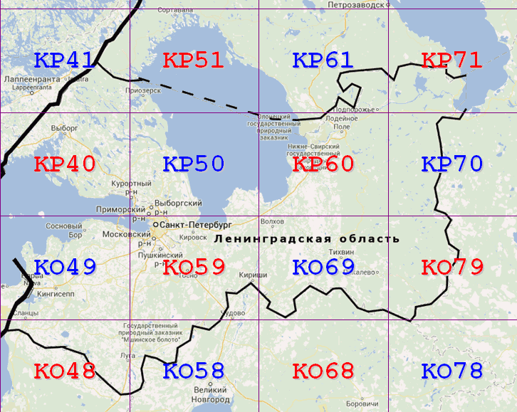 Карта больших QTH-квадратов Ленинградской области.