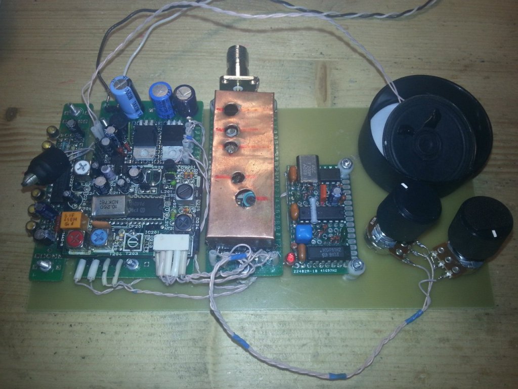 Ну раз на форуме есть раздел про золотые руки, которые неважно из каких мест растут, внесу свои три копейки в общее питреское радиодело. Собственно, переход от УКВ-тюнеров 64-108 МГц к эфиру начался вот с этих экспериментов. Первый приемник 118-137 МГц сделан на чистом интересе "приспособить куски от битой автомагнитолы Pioneer". Оттуда взята платочка ДВ/СВ ПЧ тракта - очень приличное двойное преобразование частоты. Добавлен УВЧ на двухзатворном BF961 + преобразователь частоты на TA7358. С синтезатором возиться не захотелось, достаточно было послушать две "погодных вещалки" Пулково и переговоры пилотов, ничего интересного. Попутно поигрался с синхронным детектированием на 4052. Все! Последующие 8 приемников (5 из которых были доведены до состояния попадания в корпус) уже чисто 144-146. Синтезатор частоты у всех на LC72131, прошивка PIC16F628A скачана с сайта бразильского QRPвца. С остальным - варианты. Были опробованы связки TA7358+MC3361 (TA7358 преобразователь частоты, она же самая и первый гетеродин), TA7358+TA7358+MC3361 (первая - второй каскад УВЧ + преобразователь частоты, вторая - исключительно гетеродин) - лучше, чем первый вариант, вынесенный и хорошо экранированный гетеродин со слабой связью с преобразователем частоты гораздо лучше работает с сигналами на уровне эфирного шума; SA612+MC3361, SA612+К174ХА26, SA612+SA615, MC3362 с пьезокерамическим дискриминатором, MC3362 с контуром-дискриминатором и дополнительным каскадом УВЧ на входе (двухзатворный BF961+КТ368 общая база - за ним). В варианте SA612+К174ХА26 поднял децибел на 20 усиление по ПЧ, и получился самый лучший вариант по чувствительности. Похуже, но ненамного, SA612+SA615, хотя в этой связке бонус в виде S-метра (а шумодав пришлось городить самому, он содран с MC3361). Ни в одном приемнике нет и намека на печать, все сделано на "слепышах", но - работает (т.к. химию бросил лет 8 назад, возвращаться к ней пока не хочется). Пока такой смешной вариант SDR - приемники мониторят прямой и вещательный канал репитеров:)