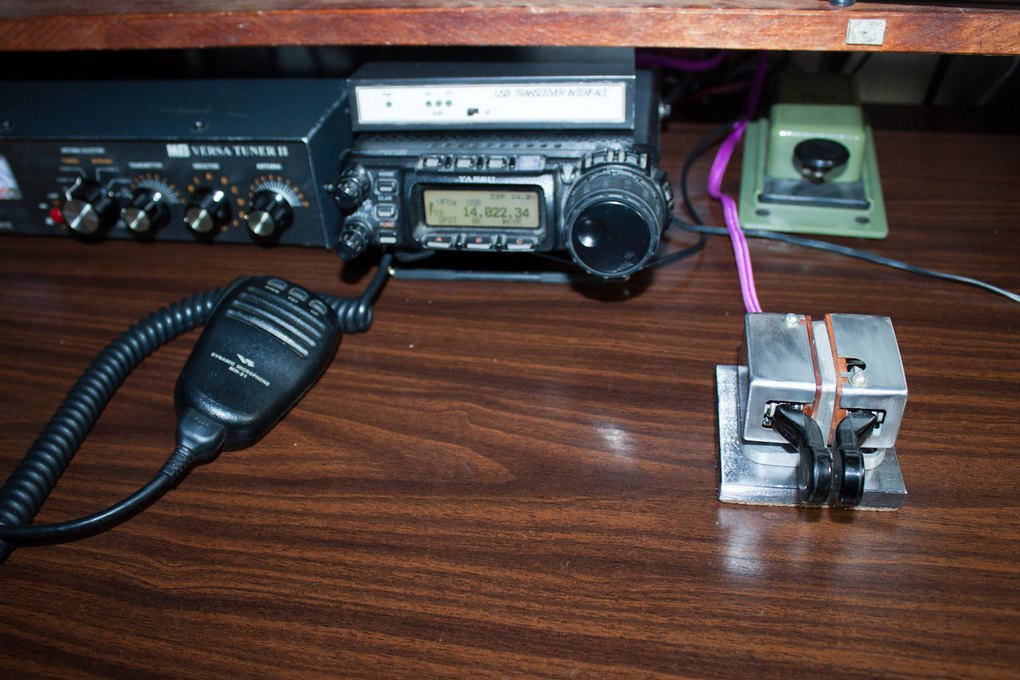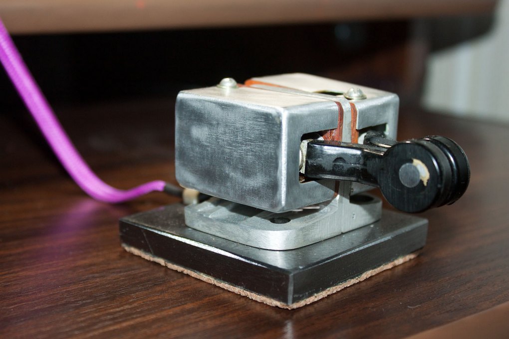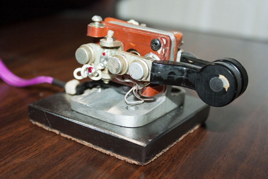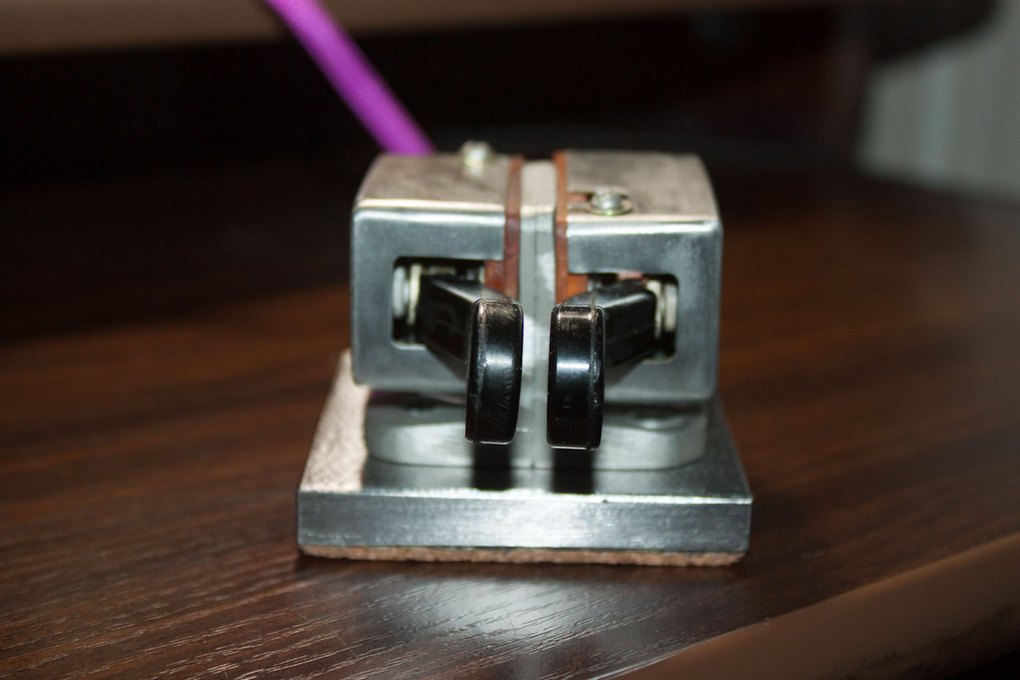 Давно хотел второй (дачный) телеграфный ямблический манипулятор и вот в интернете попалась идея данного ключа. По случаю прикупил на Удельной по 150 руб. два маленьких телеграфных “клопадава” от радиостанции р 159. Изготовил основание и кронштейн, сточил на точиле выступающею часть манипулятора, внутри под пластмассой штырь из стали все сделано по военному, укрепил ключи двумя саморезами. Пружины манипуляторов пришлось укоротить, слишком жесткие. Для неспешной работы очень не плохо работает, из минусов трудно выставить нужные зазоры контактов и отцентрировать коромысла на игольчатых подвесах, что бы не было люфтов.