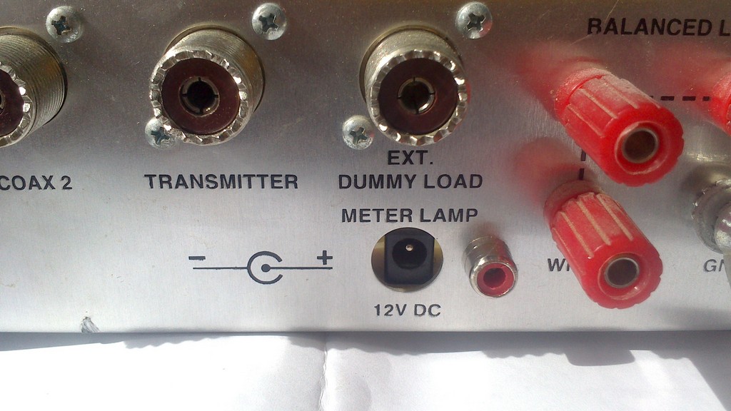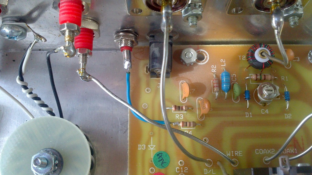Иногда бывает желание послушать свой сформированный сигнал на выходе трансивера, это удобно сделать на контрольный приемник. А если контрольного приемника нет, но есть очень простой и не требующий особых затрат способ. Практически у всех радиолюбителей на выходе TRX установлено согласующее устройство с КСВ метром или отдельный КСВ метр, а как мы знаем в любом КСВ метре есть готовый детектор прямой и обратной волны, так вот для контроля своей передачи предлагаю подключиться высокоомными головными телефонами типа ТОН-2 к выходу детектора прямой волны. А теперь все это на примере СУ MFJ-941E которое содержит в своем составе КСВ метр, необходимо только подпаять проводок с выхода резистора на 100 Ом и вывести на заднюю панель СУ разъем для головных телефонов. На фото в принципе все видно, синий проводок и разъем типа "тюльпан". Теперь переводим трансивер в режим АМ (амплитудной модуляции), детектор то простейший АМ, подключаем головные телефоны ТОН-2 и слушаем качество сформированного сигнала. Таким образом удобно подбирать микрофоны, прослушивать как сильно шумит вентилятор УМ, да и какие внешние шумы попадают на вход микрофона, настраивать микрофонный эквалайзер и т.д и т.п. Единственное, что сопротивление головных телефонов немного шунтирует выход детектора, поэтому при измерении КСВ необходимо телефоны отключать, ну этот режим и нужен для периодического контроля.
