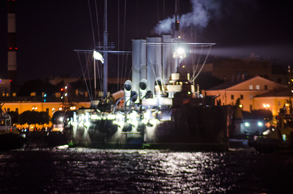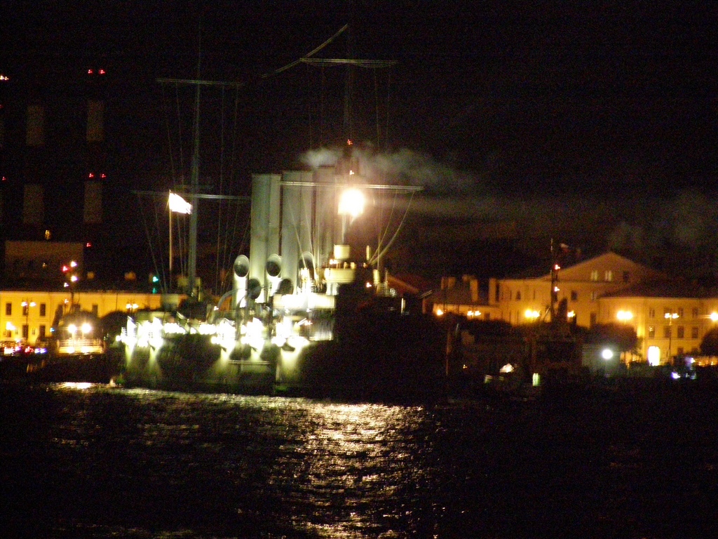Вот как мы той ночью 16 июля, с борта дебаркадера, на котором располагалась времено станция RF1A, видели прохождение Авроры на место вечной стоянки. p.s.: Ещё раз прошу прощения за фокус. Непонятки с объективом Влада...