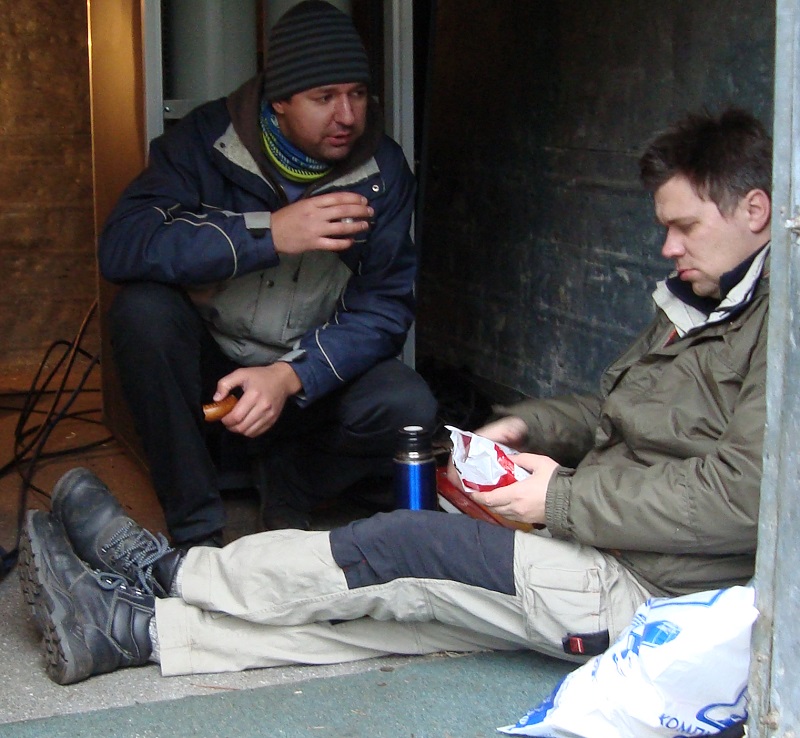 Михаил RA1ALA прокладывает оптический кабель по столбам освещения
