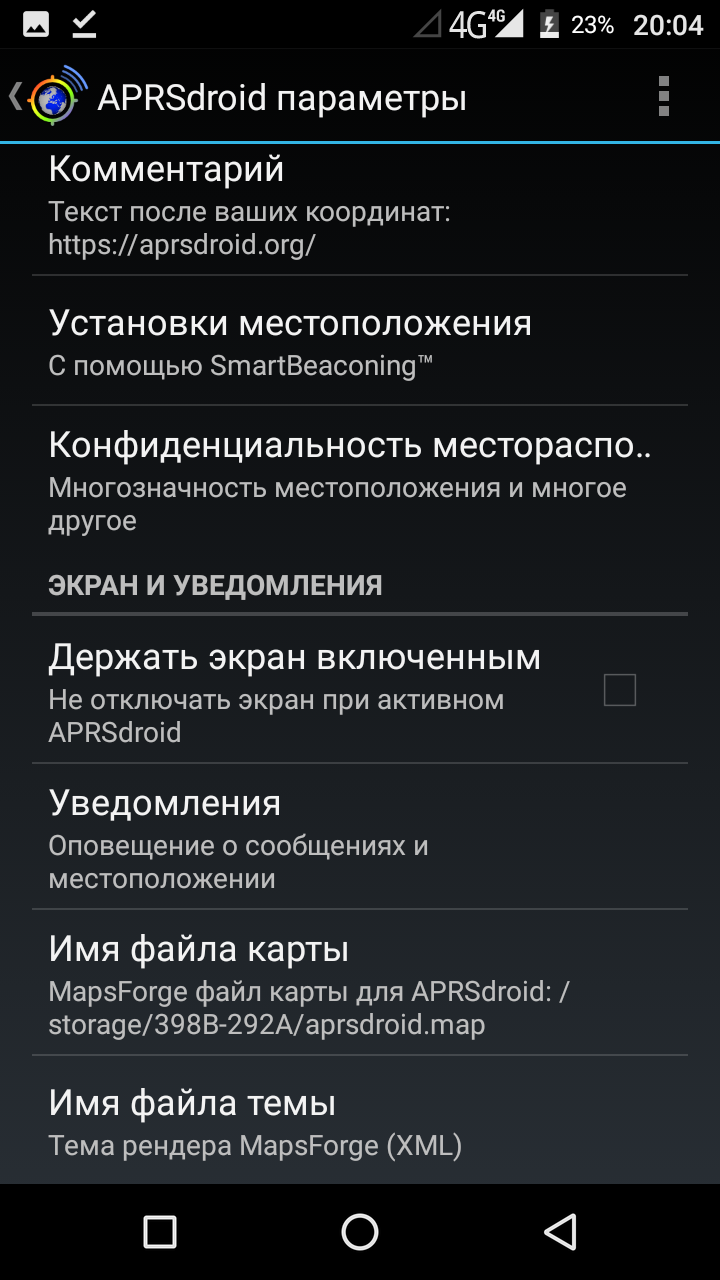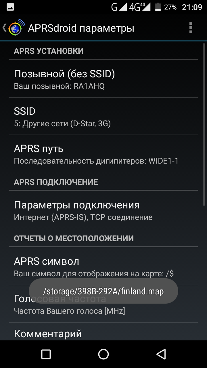 4) войти в настройки APRSdroid и указать карту aprsdroid.map в папке на внешней карте памяти. Вложение: