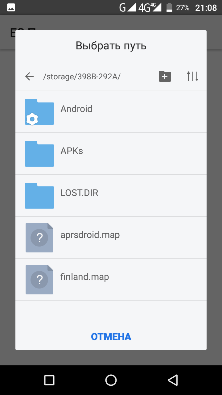 В последней версии APRSdroid от 2018-11-18 OSM можно выбрать карту в произвольной папке. Тогда, инструкция, которая была раньше, верна. Но к ней уточнение - никакой SDCARD выбирать не нужно. Нужно поменять путь к файлу *.map, и всё. Инструкция новая: 1) скачать программу https://aprsdroid.org/download/builds/A ... 18_osm.apk2) загрузить карту Северо-Западного федерального округа с FTP сервера http://ftp-stud.hs-esslingen.de/pub/Mir ... v3/russia/3) переименовать карту (не обязательно) и переместить в Проводнике на карту памяти. Вложение: