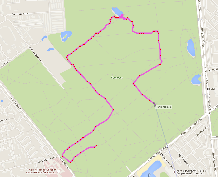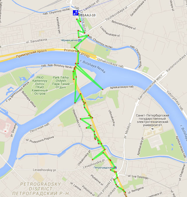 Да нормально GPS работает. Это потому что Андрей, UB1AAJ-10,двигался по Каменноостровскому пр. который с обоих сторон хорошо закрывается домами, и внутренний GPS в его смартфоне периодических терял из-за этого сигнал, и переключался на приблизительное позиционирование по базовым станциям GSM. Поэтому трек получился такой корявый.