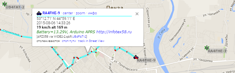 UA1CKA писал(а): Спасибо. Какие данные нужно изменить под себя кроме позывного в этом исходнике и где схему посмотреть подключения ардуно к радиостанции и что еще нужно для апрс трекера? Оригинал брал тут http://www.kh-gps.de/qaprs.htmВыкинул R10 R11 R10* T2, на порт A0 вешаем стабилитрон на 5,1v, верхний вывод потенциометра P2 вешаем через резистор 5-10 КОм на +12v борт сети авто. Данные изменения по железу для последней версии скетча. На карте отображается так...