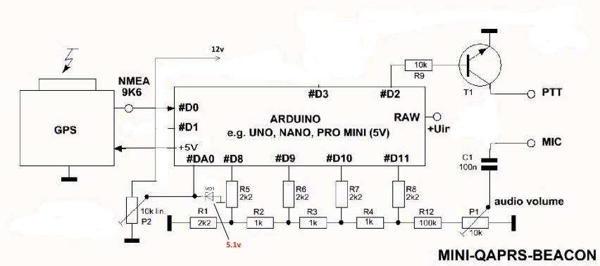 RA4FHE писал(а): Оригинал брал тут http://www.kh-gps.de/qaprs.htmВыкинул R10 R11 R10* T2, на порт A0 вешаем стабилитрон на 5,1v, верхний вывод потенциометра P2 вешаем через резистор 5-10 КОм на +12v борт сети авто. Данные изменения по железу для последней версии скетча. На карте отображается так... R10* T2 ?, в оригинальной схеме R10* стоит на коллекторе T1 его вы имели ввиду ? Средний вывод подстроечного резистора Р2 идет к стабилитрону 5.1v ? Какие вы транзисторы использовали ?