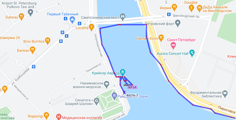 Наш коллега из 7-го района (Краснодарский край) посетил крейсер Аврора и сейчас идёт по Петровской набережной в сторону Петропавловской крепости. Вложение: