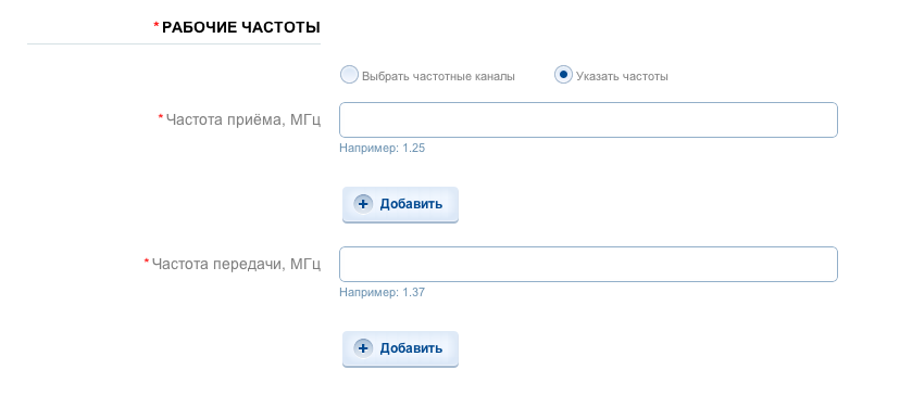 Предполагаю, что на каждый диапазон частот из приложения отдельную запись. Там где разрешена передача - тот участок в оба поля. Там где не разрешена - только в одно (правда поле передачи обязательное). В общем как всегда - госуслуги рулят, ничего не понятно. Может заполнить в соответствии с примером Weather? Код: 1,830-1,843 1,875-2,000 3,510-3,750 7,025-7,175 21,010-21,149 21,225-21,450 28,010-28,199 28,550-29,300 29,520-29,700 144,000-146,000 430,000-440,000 Но тут опять же не указаны частоты на которых разрешена передача, а на которых прием.