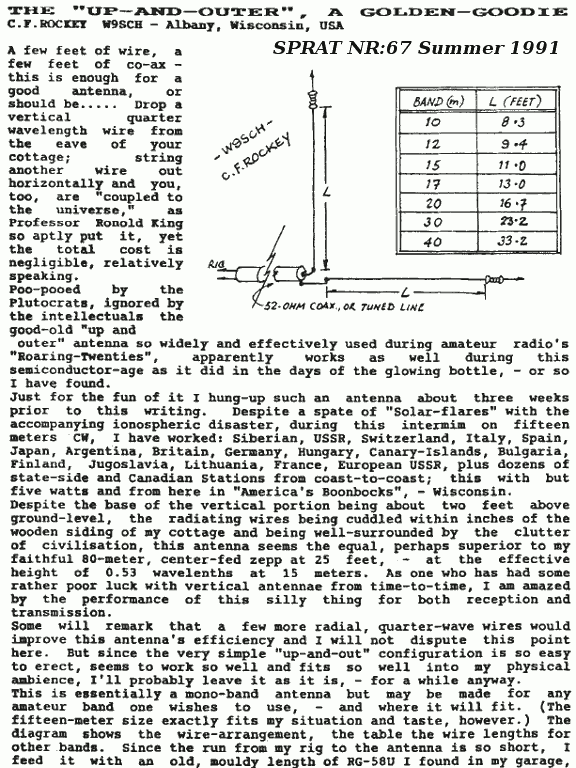 Оказывается, однодиапазонный вариант данной антенны на один из диапазонов 10,12,15,17,20,30,40 метров впервые описан в ежеквартальном издании QRP-стов "SPRAT" в 1991 году, #67. === Американец C.F.Rockey W9SCH называет такую антенну "UP-and-OUTER". "Некоторые скажут, что добавление противовесов улучшило бы эффективность". Но антенна настолько проста для воздвижения, что добавление противовесов усложнило бы её конструкцию. Несмотря на то, что нижняя часть всего в 2 футах от земли, однодиапазонная антенна "UP-and-OUTER" работает лучше "на даль", чем диполь на диапазон 80 метров на высоте 25 футов". Автор статьи поражен эффективностью данной простой антенны: " Cработаны страны: Сербия, СССР, Швейцария, Италия, Испания, Япония, Аргентина, Великобритания, Германия, Венгрия, Канары, Болгария, Финляндия, Югославия, Латва, Франция, плюс множество станций из провинций Канады, от побережья до побережья, и всего лишь на 5 Ватт". Единственное, что забыл автор C.F.Rockey W9SCH: запорный дроссель из кабеля или защелки, которые будут совсем не лишними. Вложение: