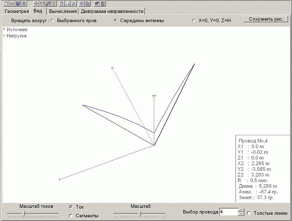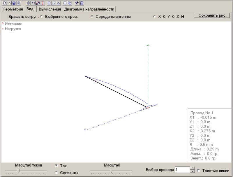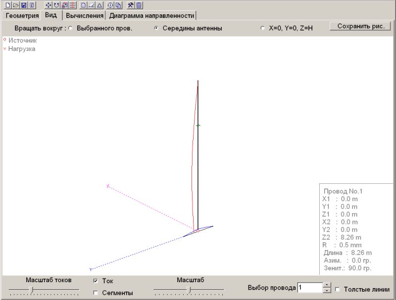 с учетом ограждения балкона в виде нижнего проводника (по оси Y), размером 2м и диам. 4см, удочка - проводник (по оси Z или X), диаметром 0,5мм(по удочке) по центру нижнего проводника Если вертикально еще более-менее, то горизонтально - совсем похо, сравните с 2-мя удочками